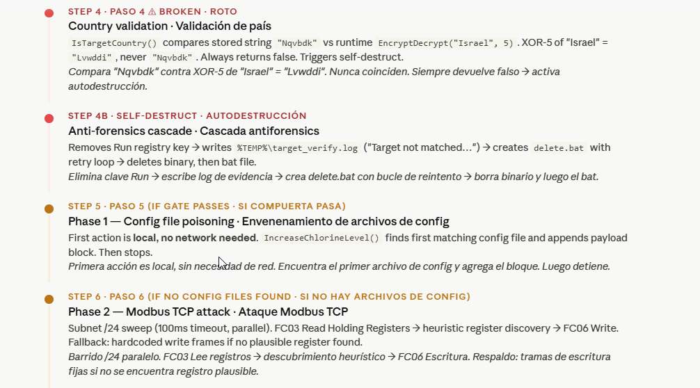 Lo que impidió que activara su carga útil al ser descubierto es un error lógico en la función de validación de país — una rutina XOR rota donde el desarrollador codificó una cadena de comparación con un método e intentó verificarla en tiempo de ejecución con uno incompatible. El resultado: el malware concluye consistentemente que no está ejecutándose en Israel e inicia la autoeliminación. Todos los demás mecanismos — persistencia, escalada de privilegios, manipulación de archivos de configuración, escritura en registros Modbus, propagación por USB — operan según lo previsto.