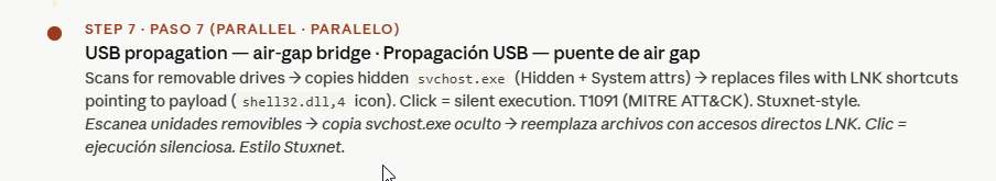 Esta técnica está clasificada bajo MITRE ATT&CK como T1091 — Replicación a Través de Medios Removibles. Es el mismo mecanismo fundamental utilizado por el exploit LNK de Stuxnet (CVE-2010-2568), que se propagó desde memorias USB infectadas a sistemas Siemens S7-300 con air gap en la instalación de enriquecimiento de uranio de Natanz en Irán. La implementación de ZionSiphon no explota una vulnerabilidad de Windows para la ejecución del LNK — depende de la interacción del usuario — pero la lógica estratégica es idéntica: asumir que el objetivo OT de alto valor está aislado de la red y usar medios físicos como vector de infección para el salto final.